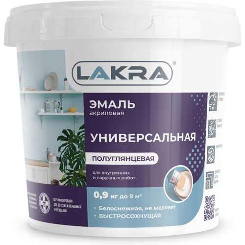 Эмаль ЛАКРА универсальная акриловая белая полуглянцевая 0,9кг